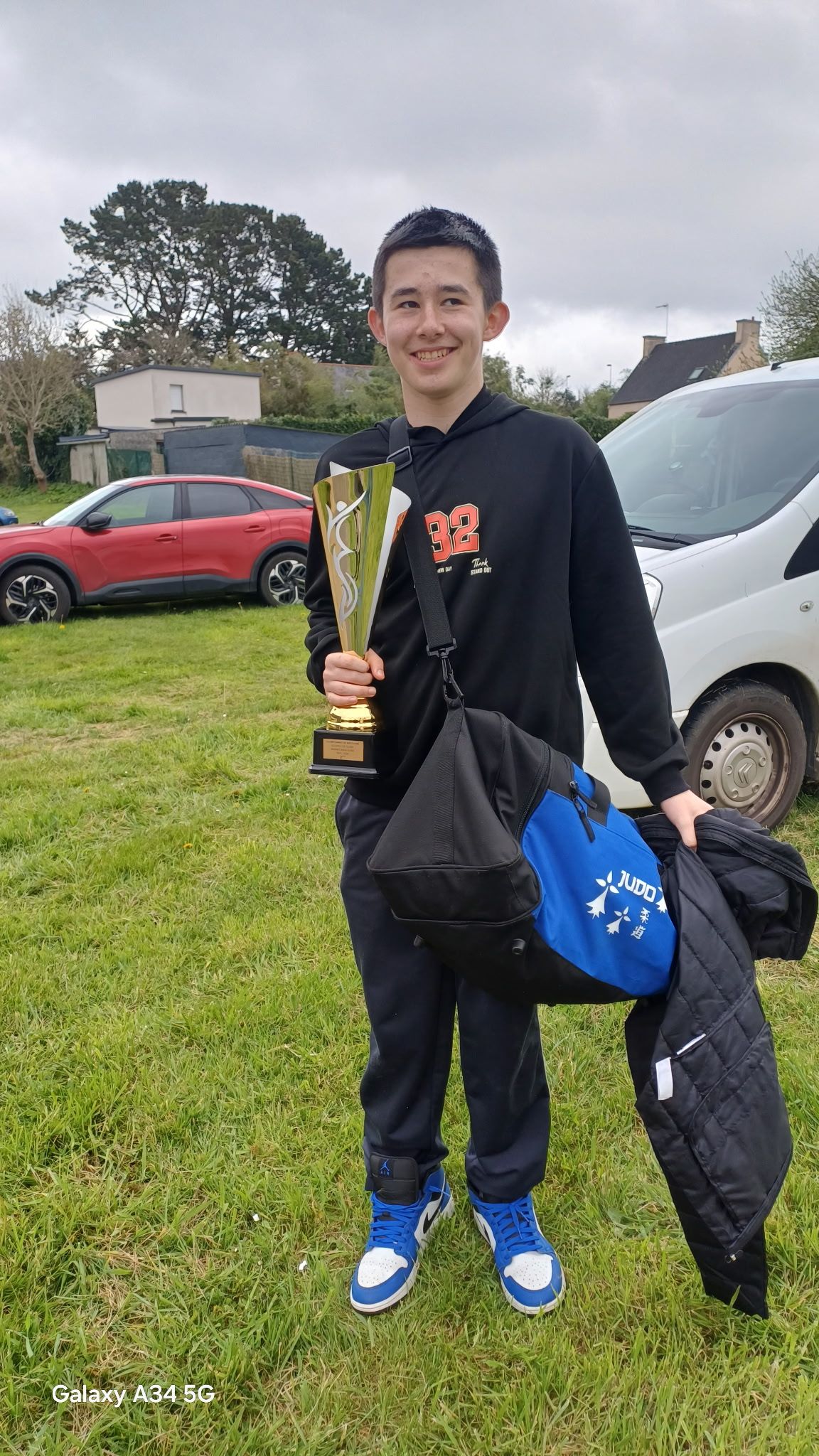 Le 04 avril se déroulait le championnat de Bretagne par équipes minimes à Gouesnou. Kentin continuait l’aventure avec le Dojo des Abers après leur titre de champion du Finistère. L’équipe sort première de sa poule et se hisse jusqu’en finale où elle ne s’incline qu’aux points après un score de parité de 3 à 3. Ils sont vice-champions de Bretagne. Félicitations à toute l’équipe et à Kentin d’avoir été un renfort de choix.